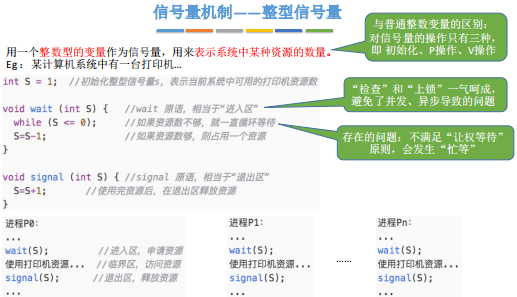 这些方法的共同缺陷是:进程在等待时持续占用CPU资源,而不是阻塞自己并让出CPU ,因此都无法满足让权等待的要求。这会导致CPU利用率降低,尤其在多道程序系统中可能严重影响系统性能。为了克服这一问题,后来引入了**信号量(Semaphore)**等机制,这些机制可以在进程等待时将其阻塞并切换至其他进程,从而实现真正的让权等待。