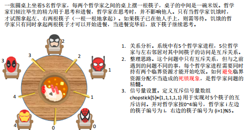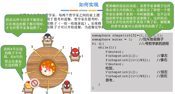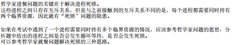 ①可以对哲学家进程施加一些限制条件:比如最多允许四个哲学家同时进餐。这样可以保证至少有一个哲学家是可以拿到左右两只筷子的