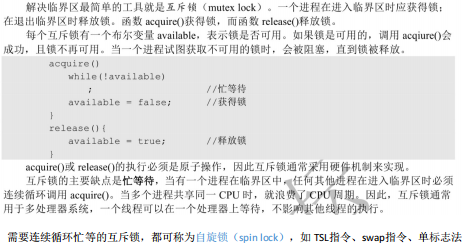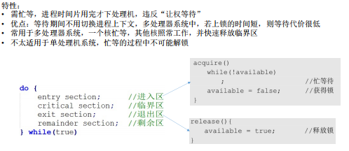 TS/TSL指令和Swap/XCHG指令:常用于实现自旋锁(Spinlock),进程会在循环中反复执行这些指令尝试获取锁,同样属于忙等待,不会主动释放CPU。