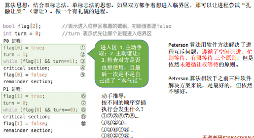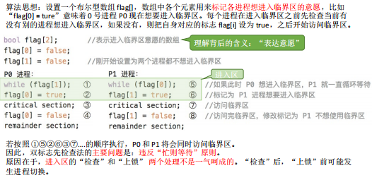 软件实现方式 :在进入临界区前,进程通常会在一个循环中反复检查条件(如标志位或锁状态),这个过程称为忙等待(Busy Waiting)。在此期间,进程持续占用CPU执行检查指令,不会主动让出CPU,因此无法实现让权等待。
