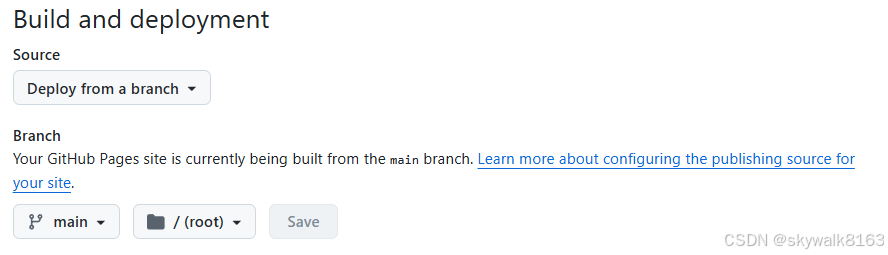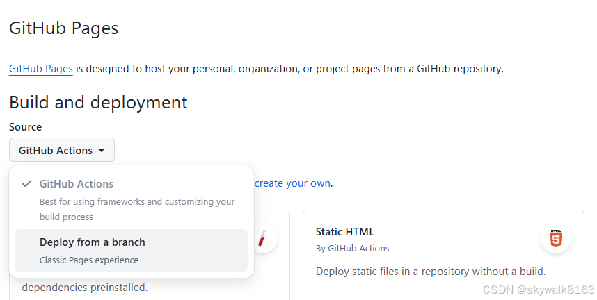在Pages展开的右边页面,打开Build and deployment下面的GitHub ACtions,选Deploy from a branch: