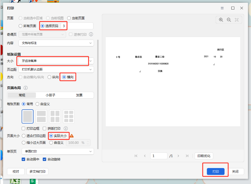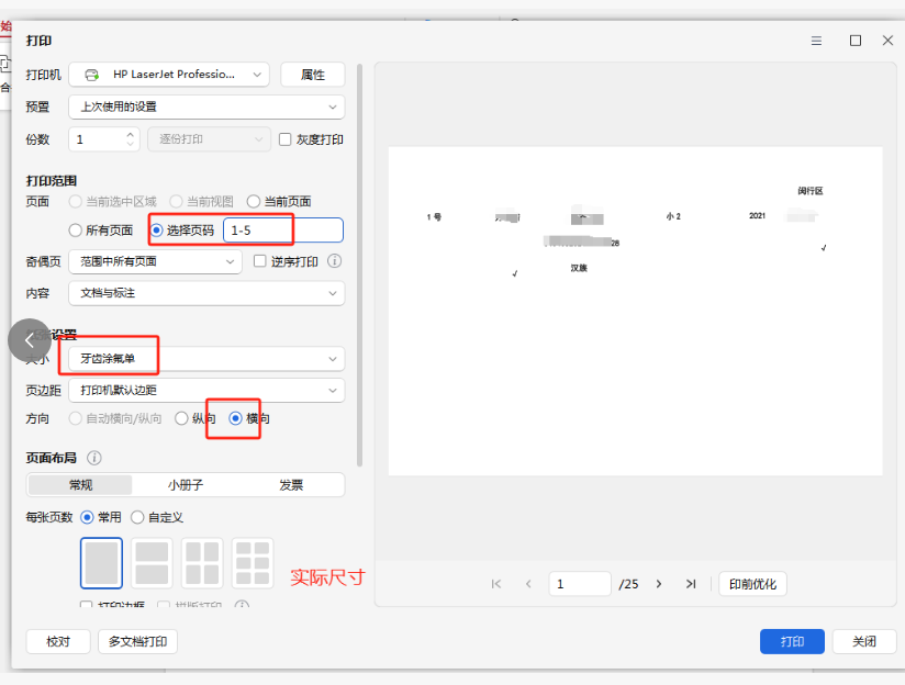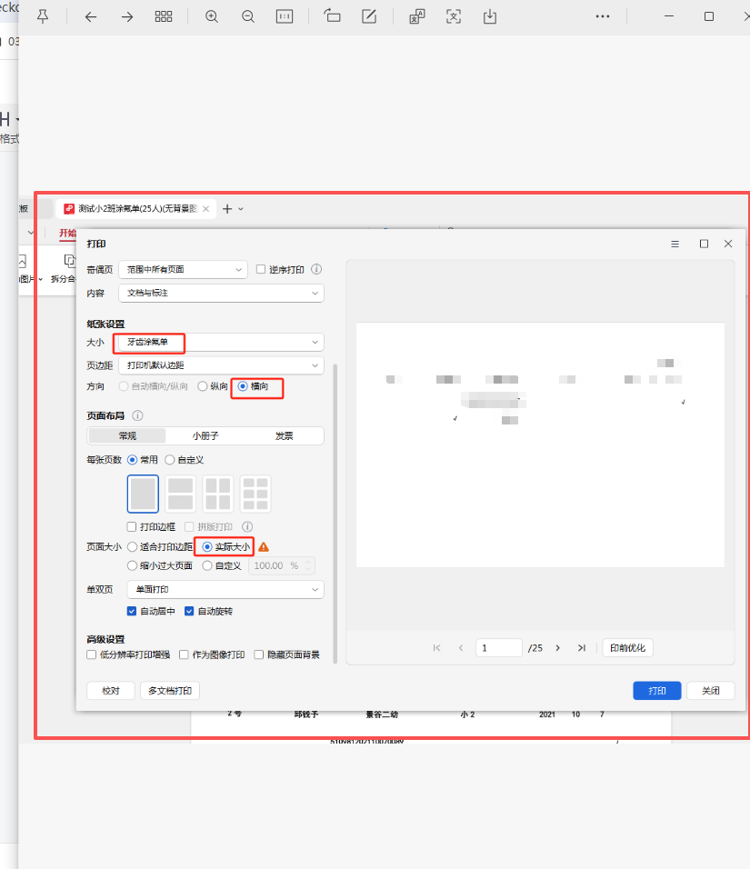 分园的电脑自定义尺寸只能设置一个,要么是15*15,要么是14*21CM,我用适合打印边距、实际大小、自定义105%都打印了一次