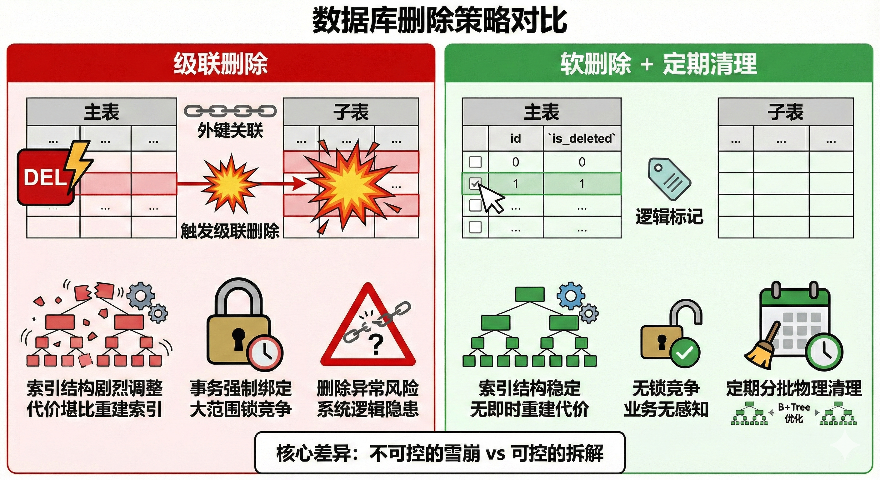 所以我们在设计时就要采用软删除+定期清理的方式来处理这个问题!!!