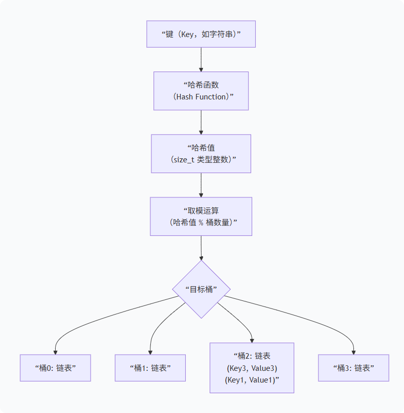 unordered_map通常采用 "链地址法" ,即每个桶里维护一个链表(或小型向量),将哈希到同一桶的所有元素链接起来。