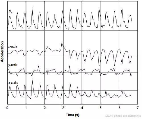 在步行过程中,人体重心会呈现周期性的起伏。反映在合加速度的波形图上,会呈现出类似正弦波的周期性变化。每走一步,都会在波形上产生一个明显的峰值。
