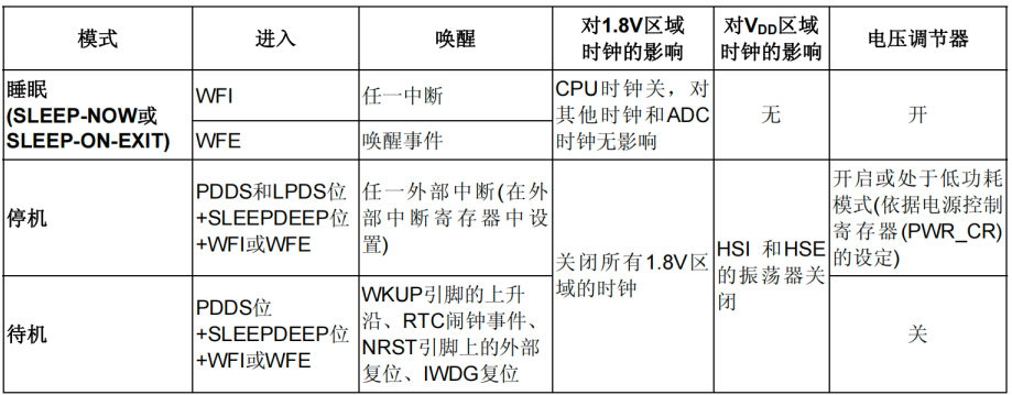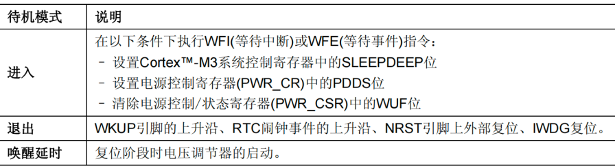 - 待机模式:调节器停止供电。除了备用电路和备份域外,寄存器和 SRAM 的内容全部丢失。