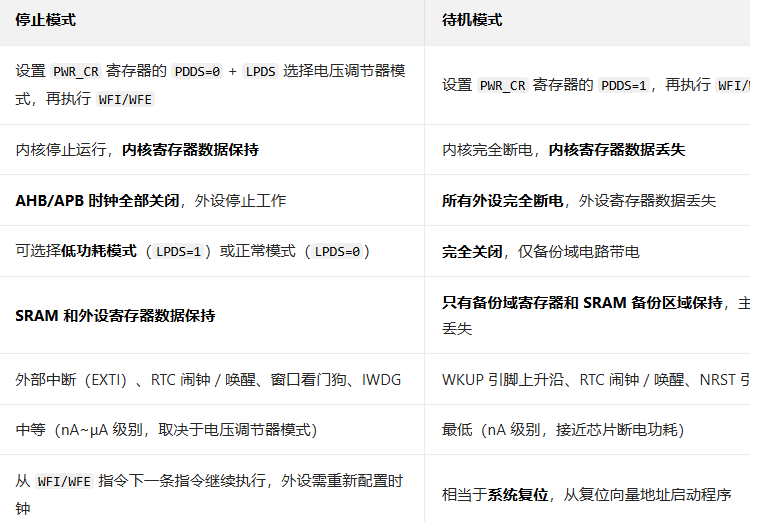 - 断电程度:睡眠模式 < 停止模式 < 待机模式,断电越彻底,功耗越低,但数据保持能力越弱。