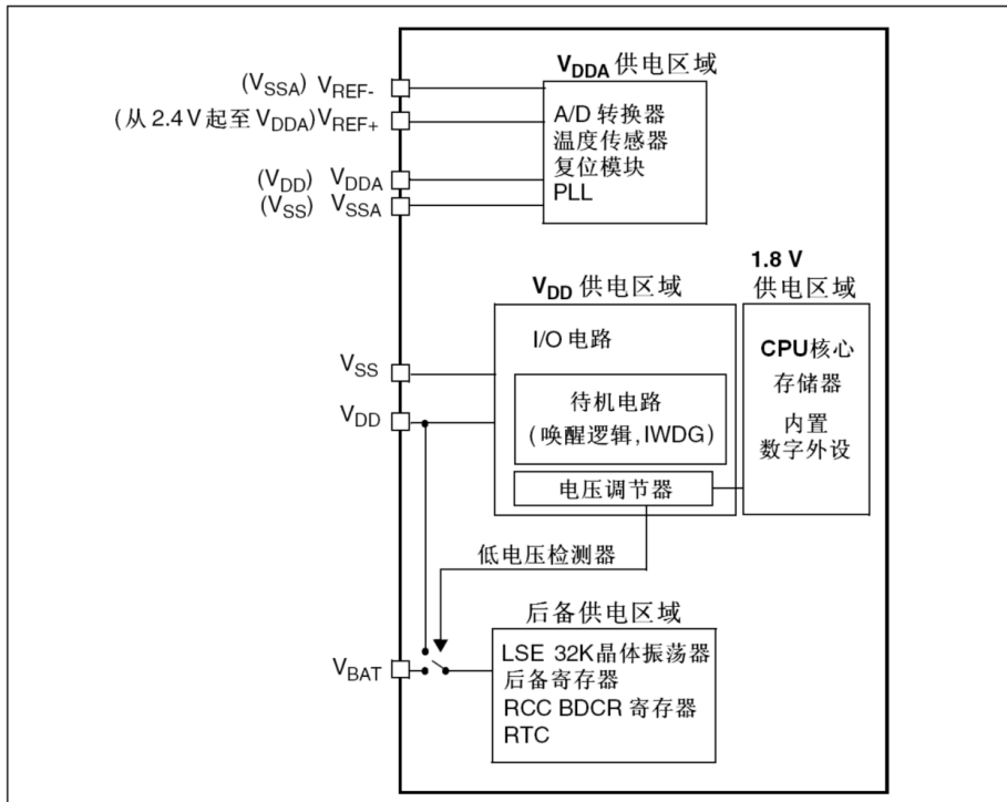 VBAT脚也为RTC、LSE振荡器和PC13至PC15供电,这保证当主要电源被切断时RTC能继续工作。