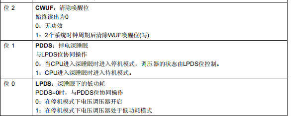 在停止模式下,通过设置电源控制寄存器(PWR_CR)的LPDS位使内部调节器进入低功耗模式,能够降低更多的功耗。