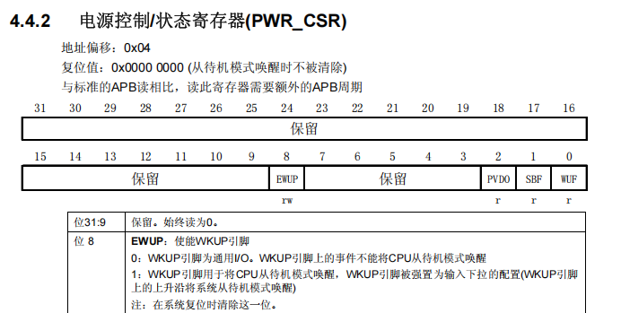 PWR外设控制,核心操作是配置PWR_CR寄存器 + 执行WFI/WFE指令。 - 唤醒后都需要重新配置部分硬件(待机模式需完全重启,停止模式需配置外设时钟,睡眠模式无需额外配置)。