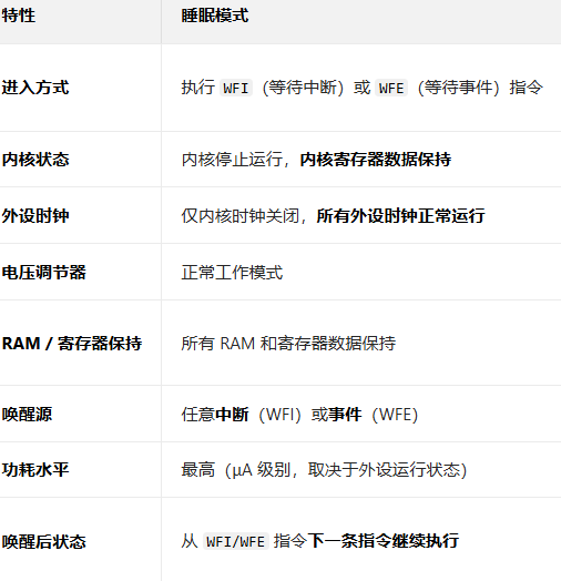 - 唤醒难度:睡眠模式最容易(任意中断 / 事件),待机模式最难(仅特定唤醒源)。