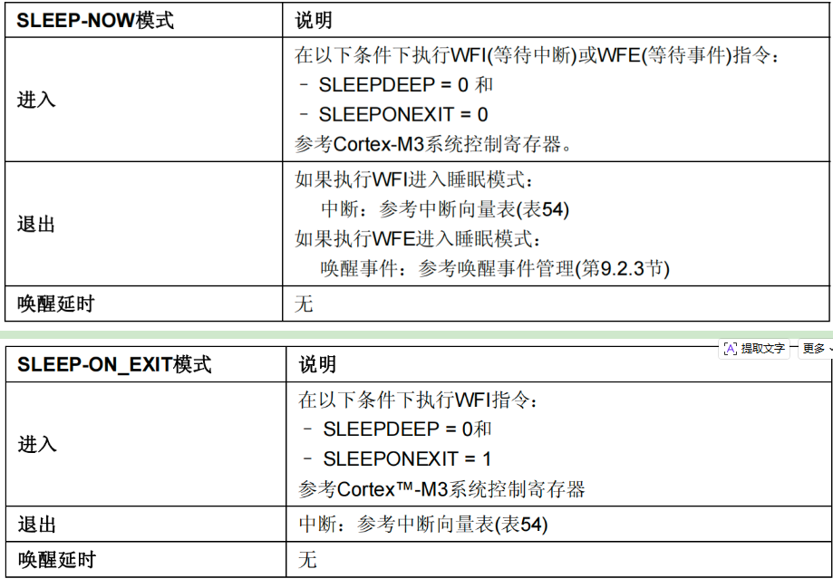 - SLEEP-NOW:如果SLEEPONEXIT位被清除,当WRI或WFE被执行时,微制器立即进入睡眠模式。