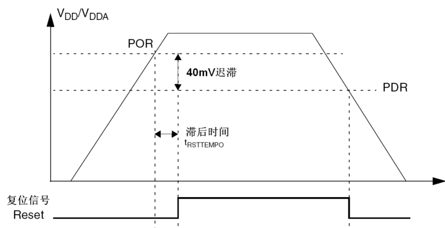 类似于按键(有延迟),当VDD/VDDA低于指定的限位电压VPOR/VPDR时,系统保持为复位状态,而无需外部复位电路。