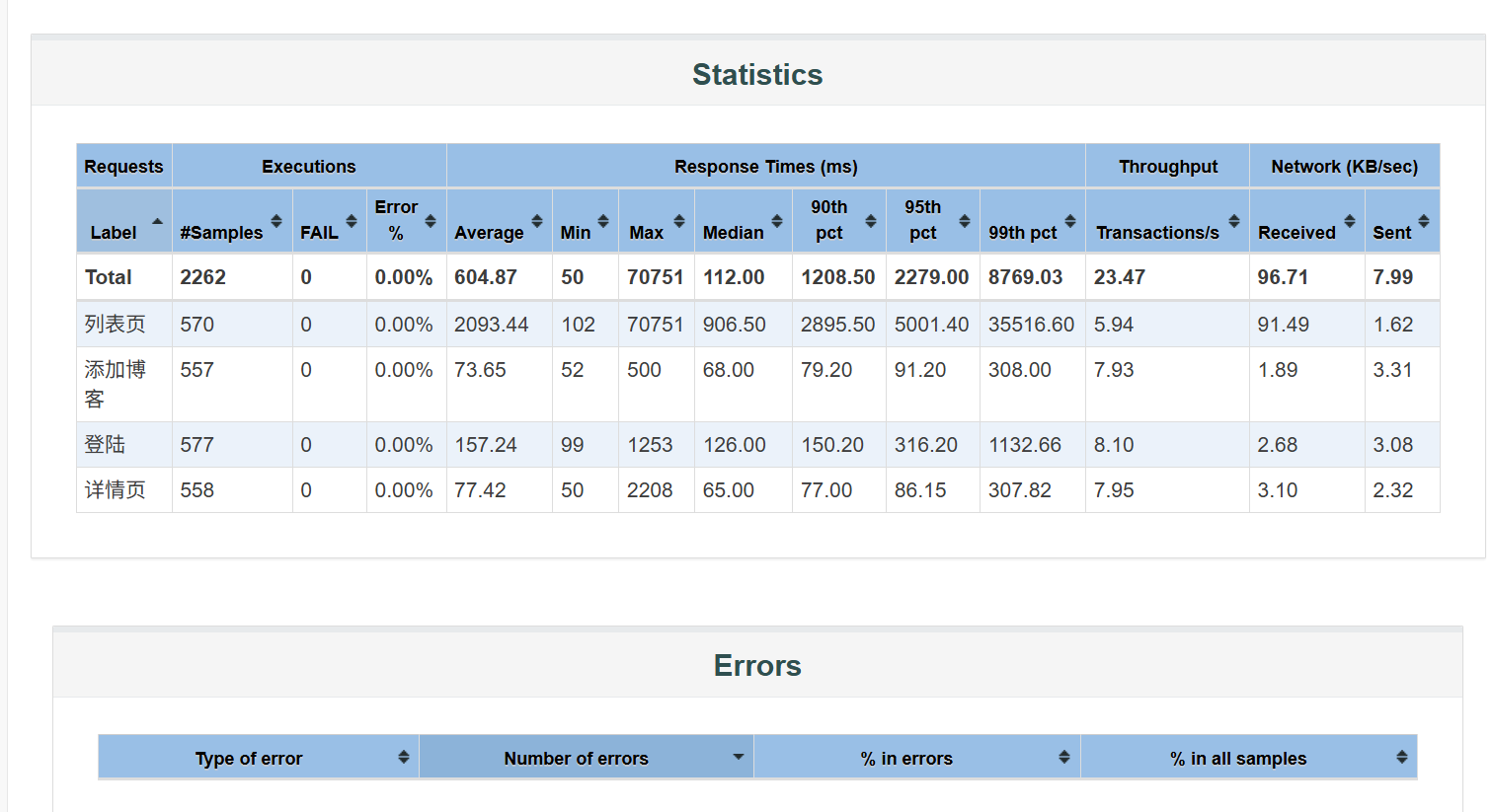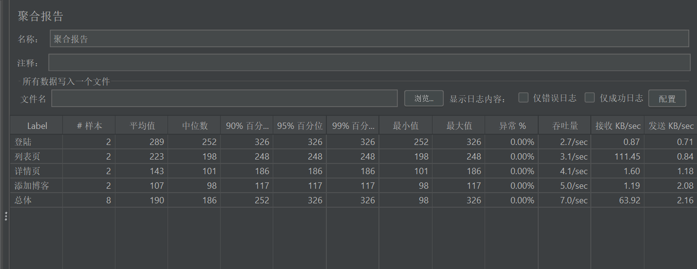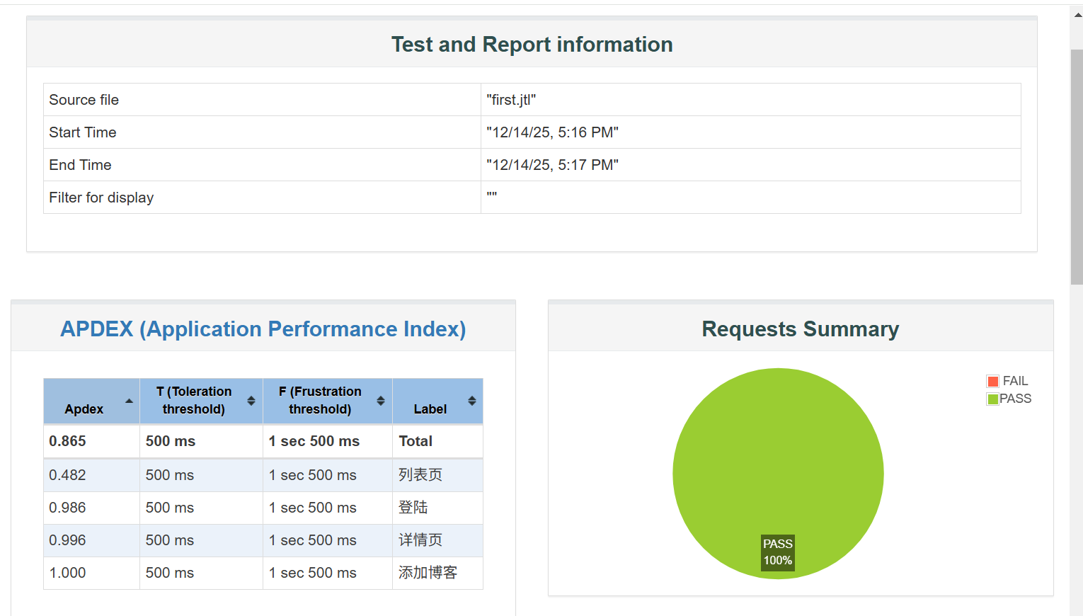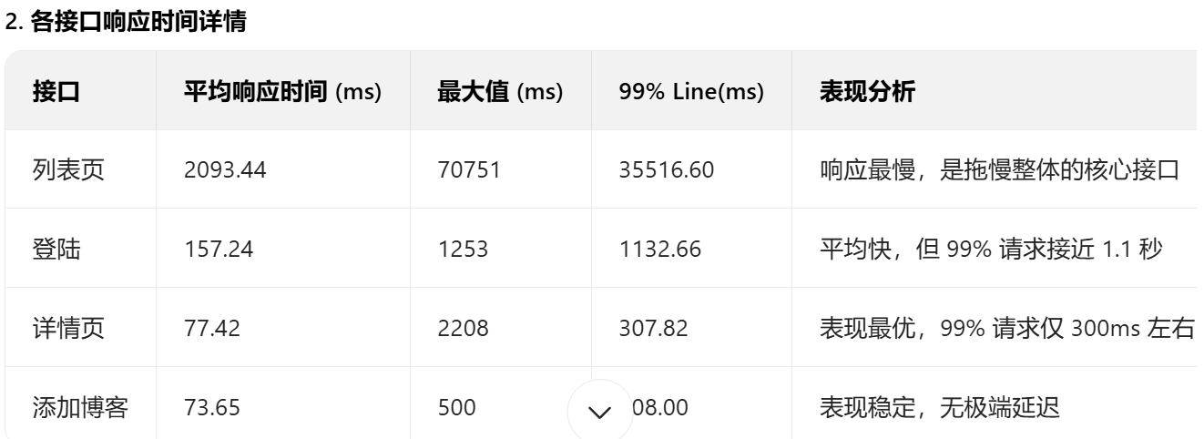 - 各接口吞吐量(按请求数占比):列表页(5.94)、添加博客(7.93)、登陆(8.10)、详情页(7.95)------ 接口间吞吐量分布较均衡,但整体吞吐量不算高(1 分钟仅处理 2262 个请求)。