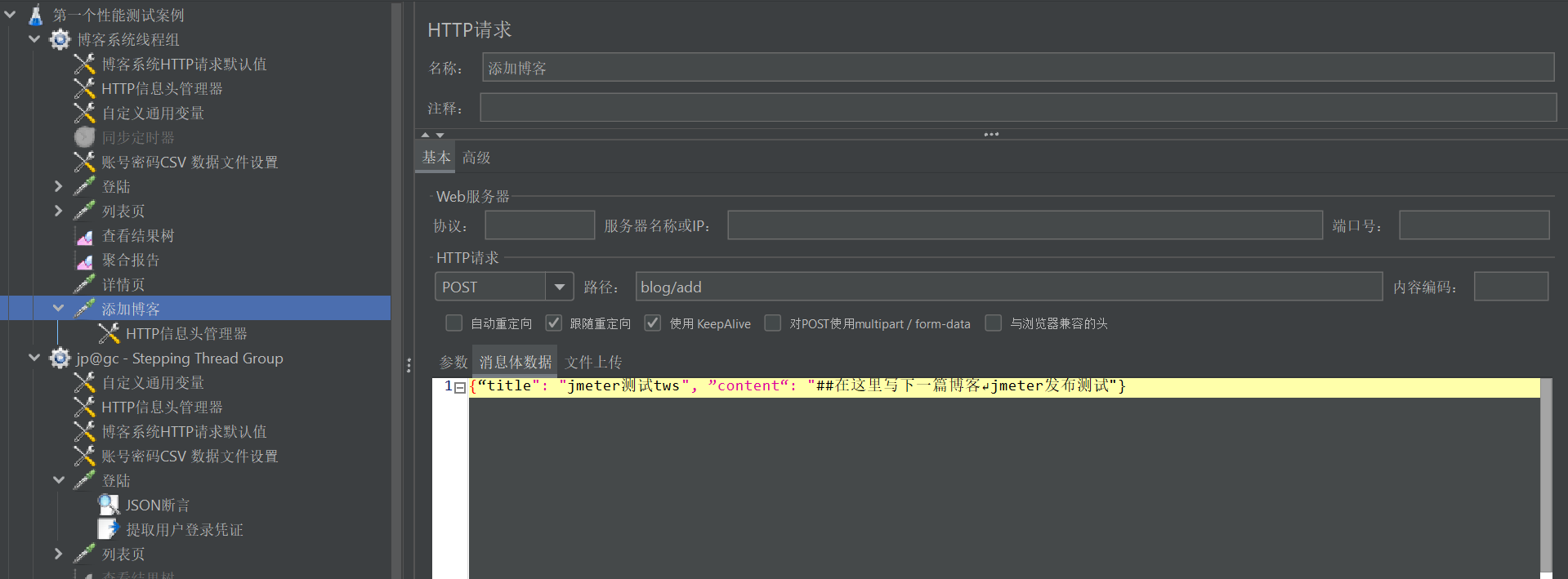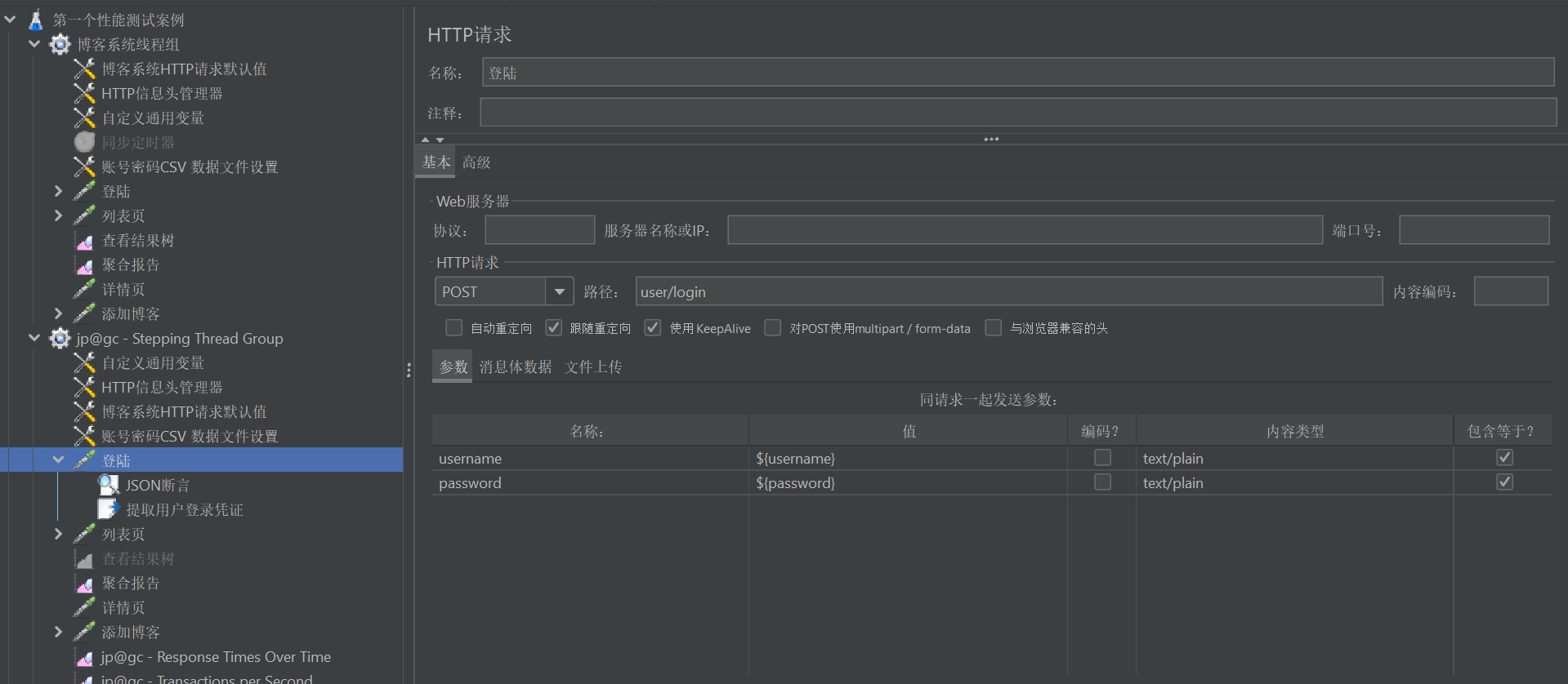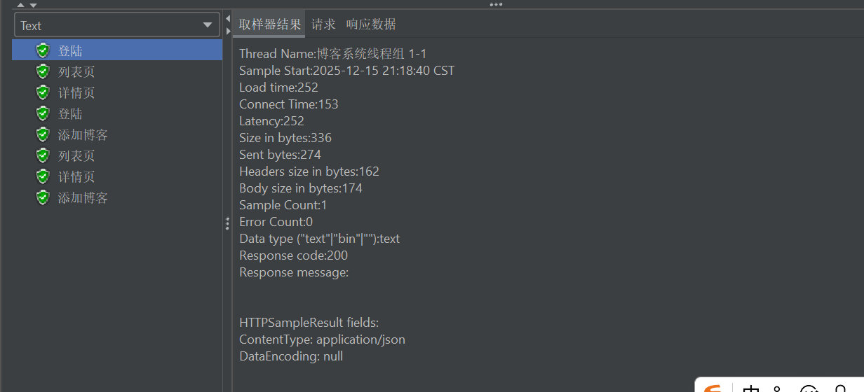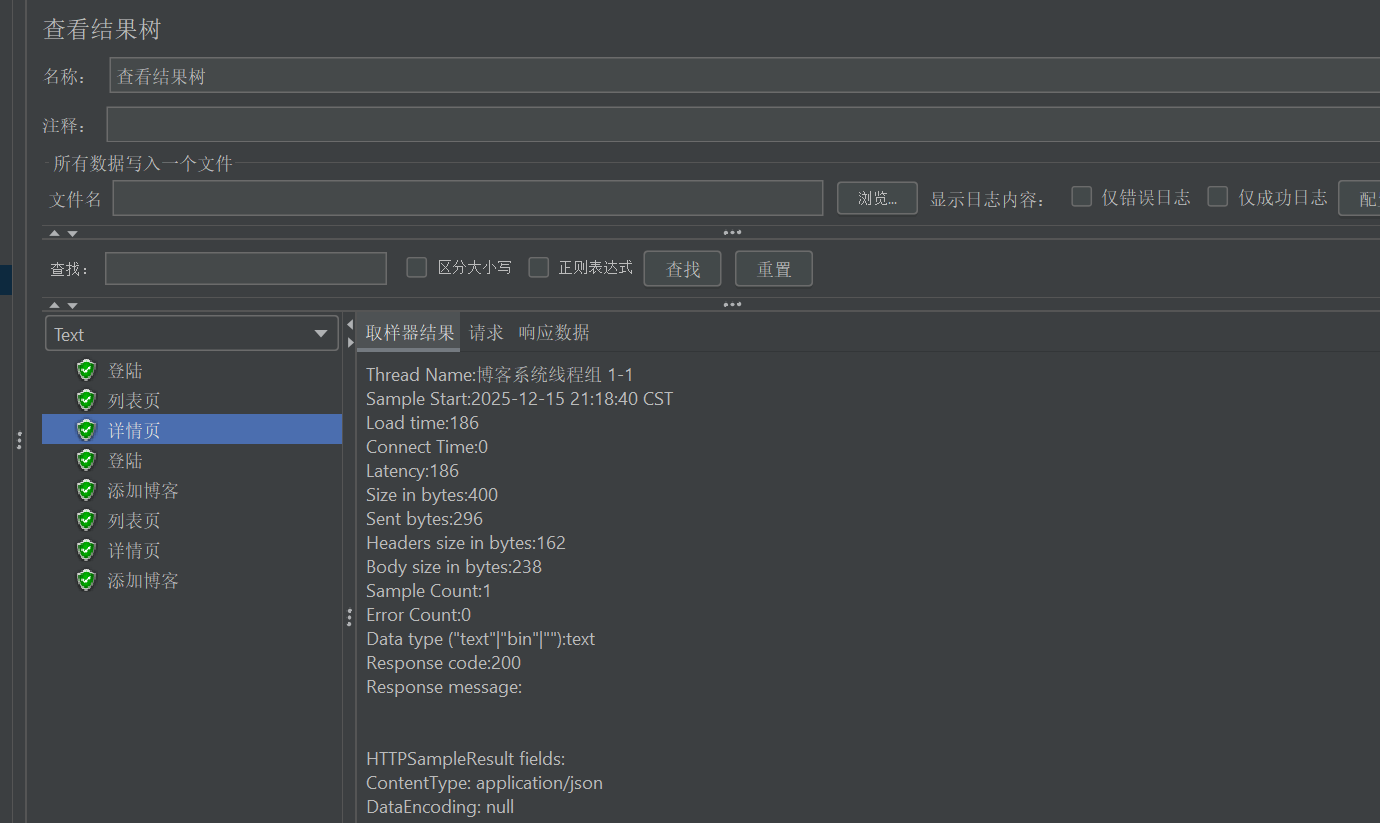 - 各接口吞吐量(按请求数占比):列表页(5.94)、添加博客(7.93)、登陆(8.10)、详情页(7.95)------ 接口间吞吐量分布较均衡,但整体吞吐量不算高(1 分钟仅处理 2262 个请求)。