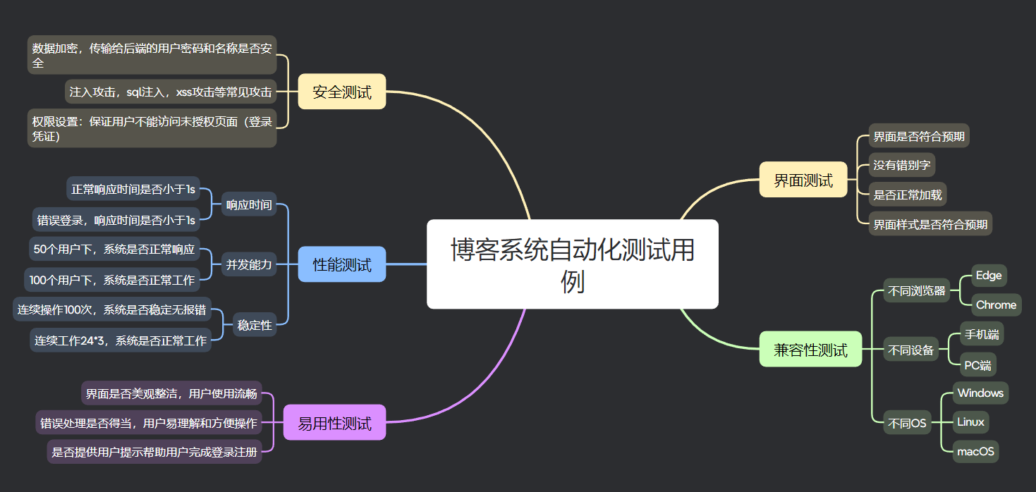 本项目针对个人博客系统开展全维度自动化测试,覆盖系统核心模块(登录界面、首页、详情页、编辑页),围绕功能、安全、性能、界面、兼容性、易用性 6 大测试方向设计用例,验证系统在不同场景下的可用性、稳定性与可靠性。