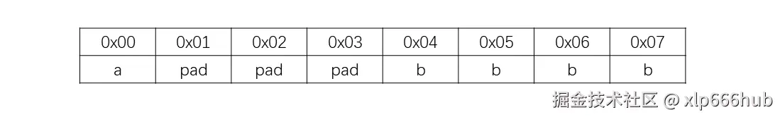 目前大小为 5,需要补齐到 8 (这是4的倍数)。所以在 char b 后面,编译器会加 3 个字节的 Padding。