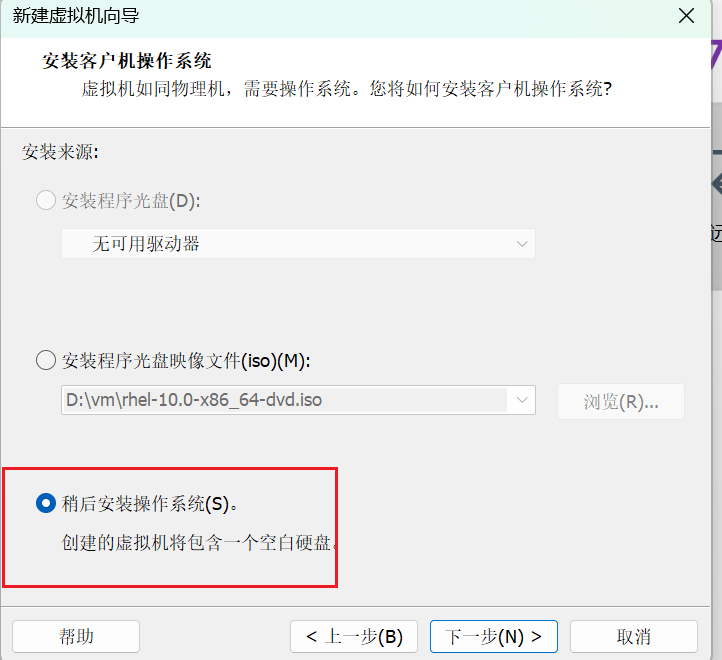 - 选择 "稍后安装操作系统"(因为我们直接使用现有磁盘)。