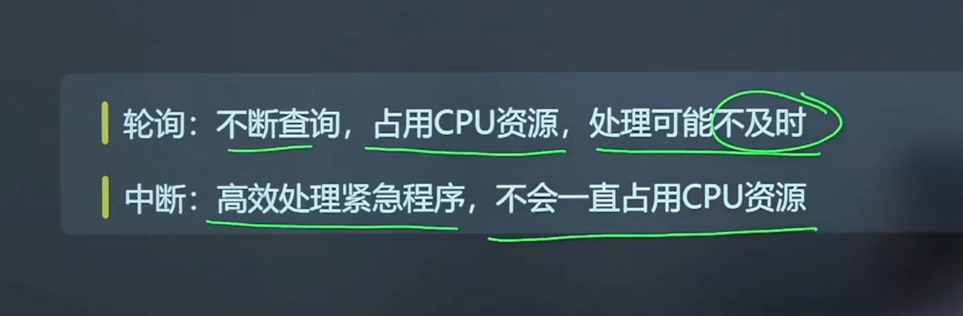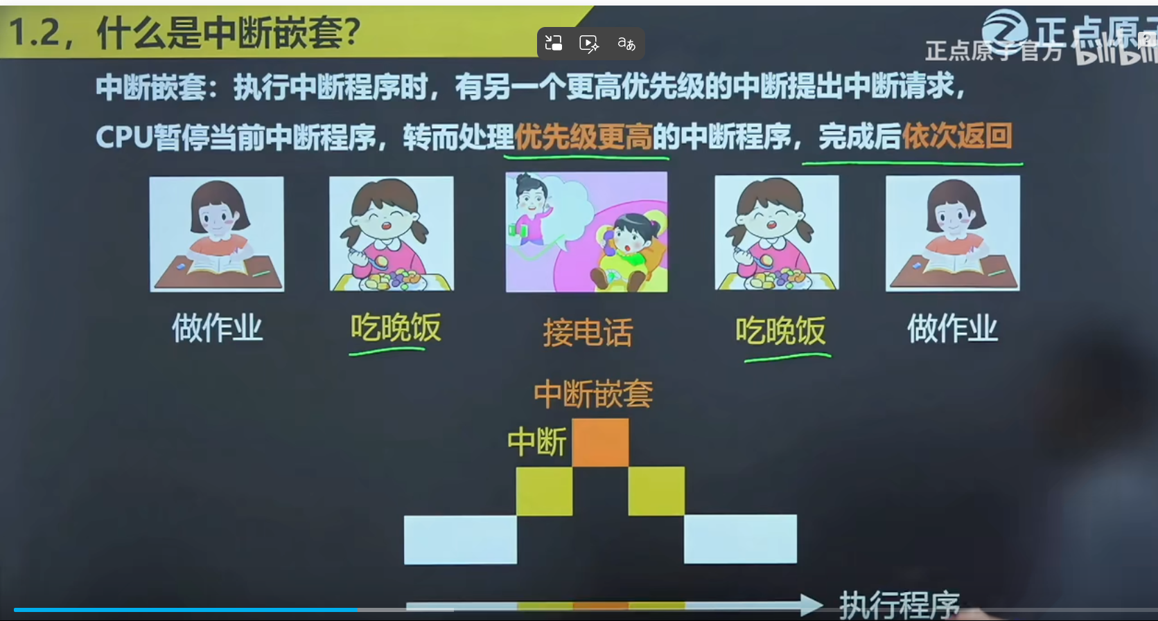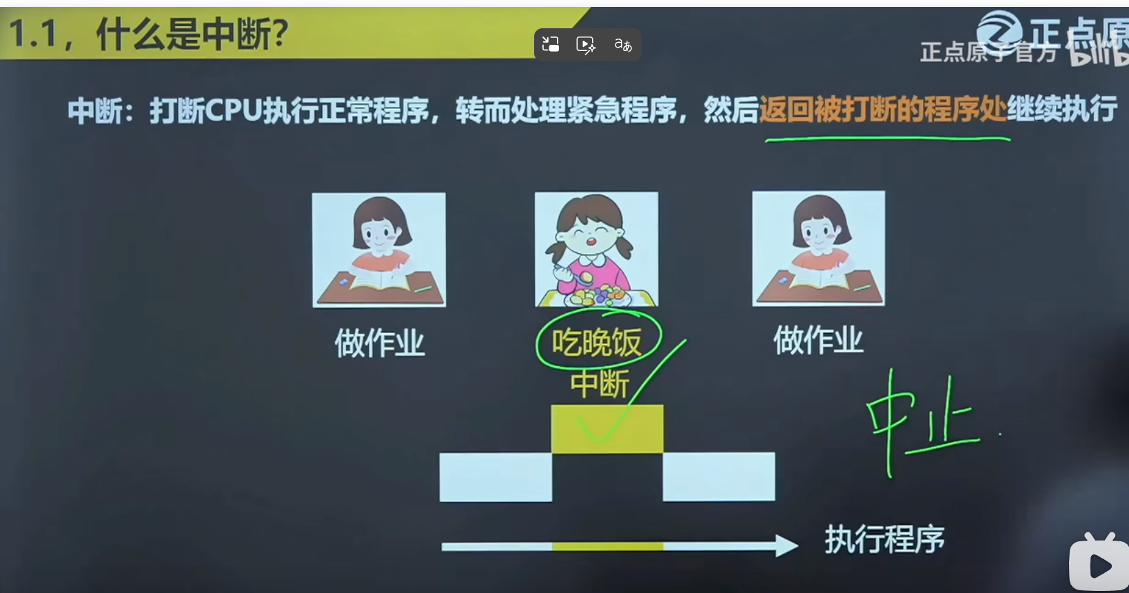 中断:处理程序执行过程中的特殊事件,然后返回被打断的程序继续执行