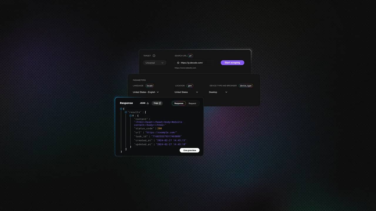 对于大量或复杂的抓取,处理IP轮换、CAPTCHA解决和JavaScript渲染的API可以为您节省大量工程时间。它们简化了扩展,您调用单个端点并获得清理、结构化的数据。这种方法让您的团队专注于业务逻辑而不是基础设施。