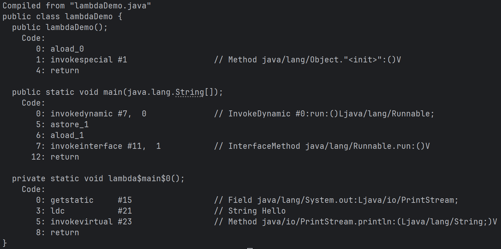 会看到有一个私有静态方法:private static void lambdamain0(),并且main方法中有一条invokedynamic指令,这个指令调用动态方法连接,#7指向常量池中BSM的引用,触发JVM的BSM(Bootstrap Mathod),通常是LambdaMetafactory.metafactory,来创建一个实现了Runnable接口的对象,并返回其引用
