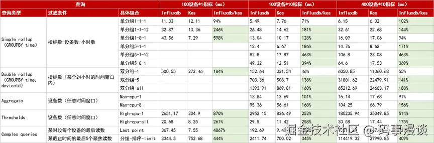 - 简单聚合查询(如单设备短时间窗口聚合):两者响应时间接近,毫秒级完成。