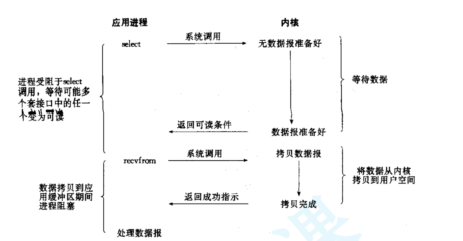 阻塞式I/O是最传统、最简单的I/O模型。应用程序发起I/O调用后,进程会被挂起(阻塞),一直等待数据就绪且数据从内核拷贝到用户空间后才会返回,整个过程应用程序处于完全等待状态。(所有的套接字默认都是阻塞方式)这种I/O模型就像一个人去钓鱼然后一直盯着鱼竿看鱼儿是否上钩了。