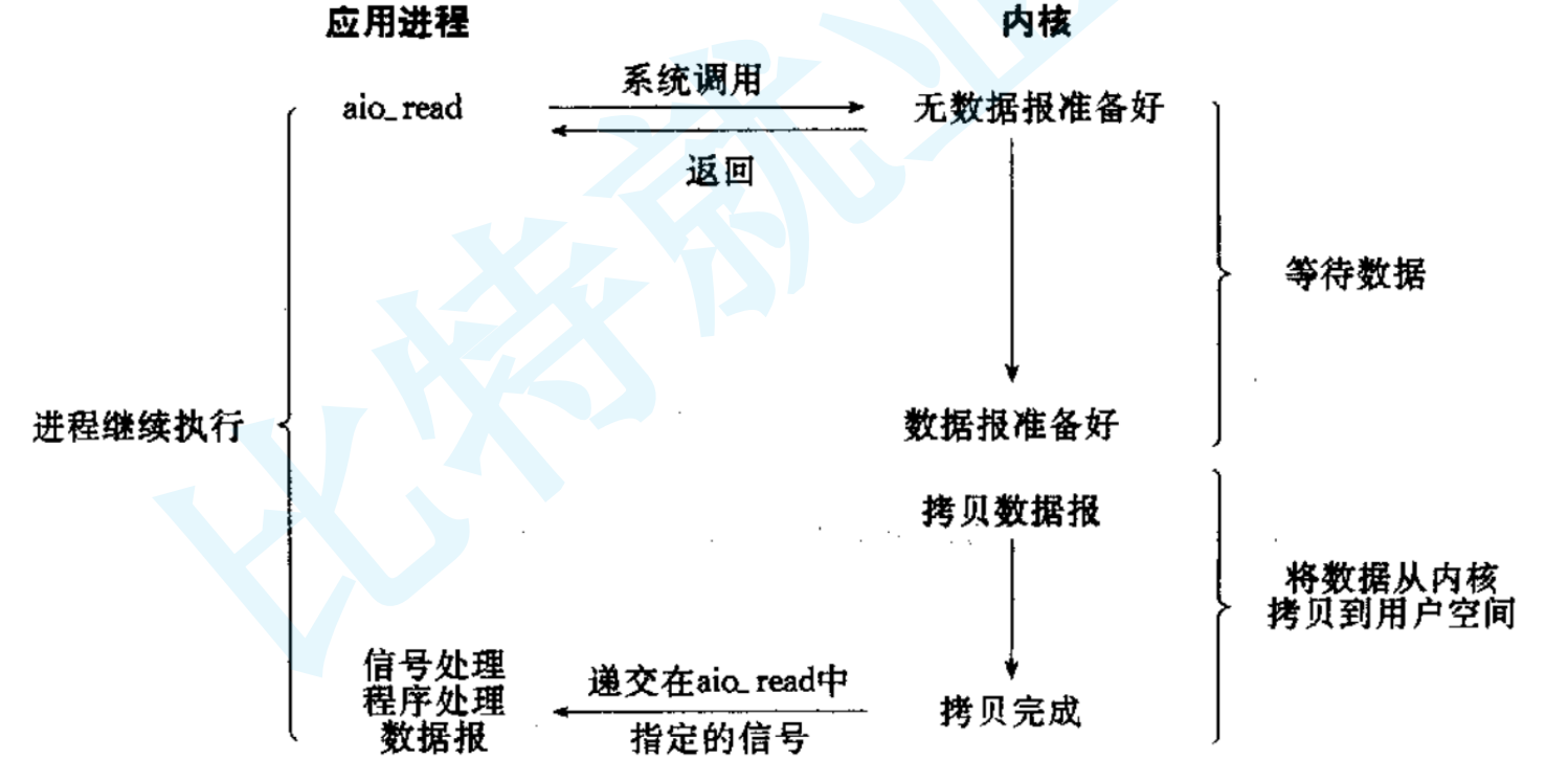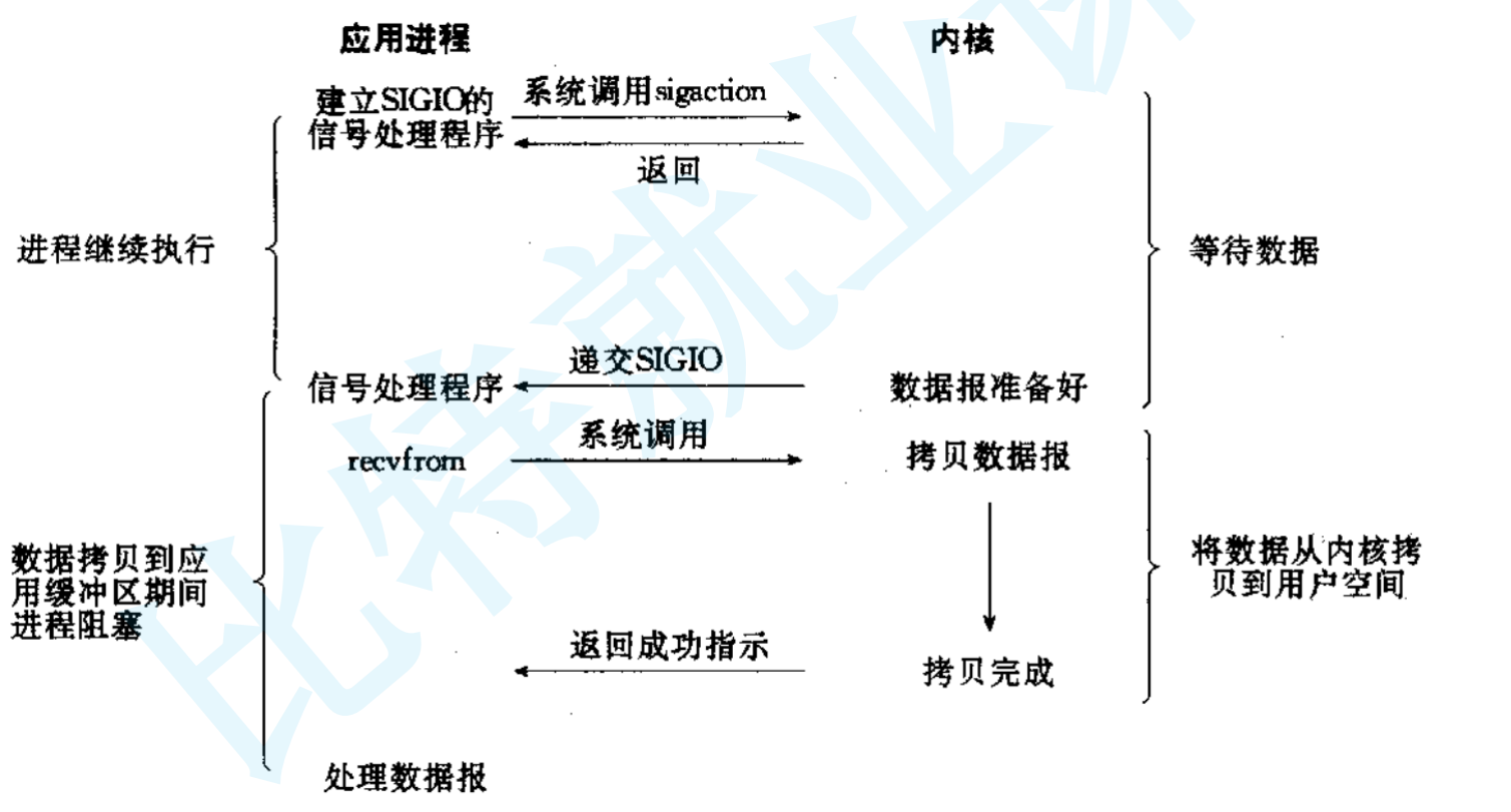 应用程序发起I/O调用后立即返回因此不会阻塞进程(此时SIGIO依旧被特殊处理,信号处理函数被设置)当数据就绪的时候内核会发送SIGIO信号通知应用程序,应用程序在信号处理函数中进行实际的I/O操作。这种I/O模型就像一个人去钓鱼,然后当鱼儿上钩的时候铃铛就会响,这样就提醒钓鱼人去拉鱼竿了。