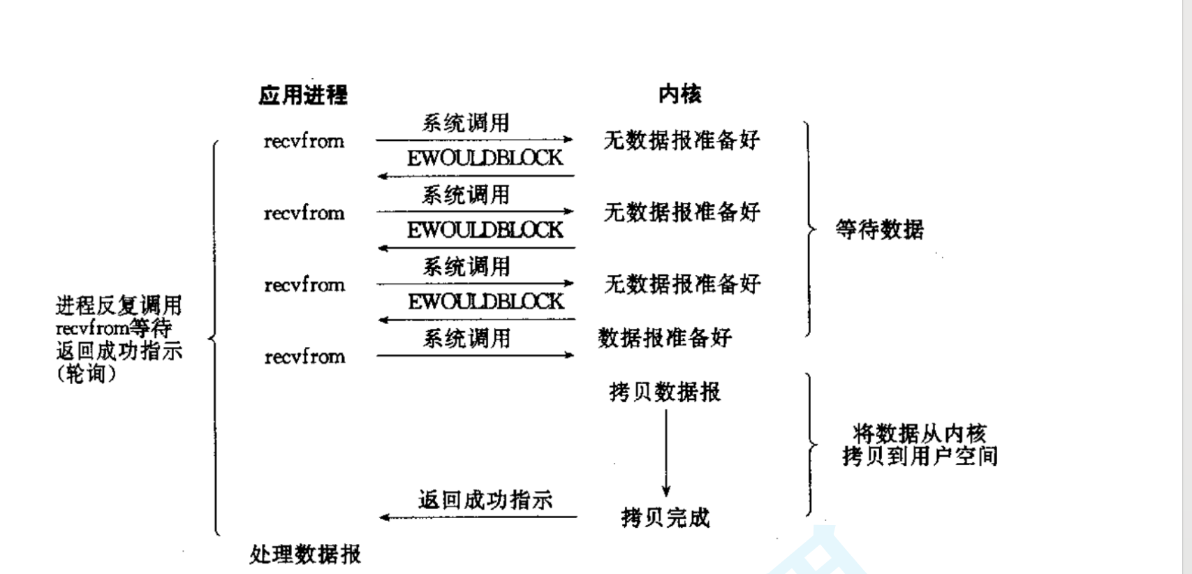 所以, 为了解决上述问题(阻塞read不一定能一下把完整的请求读完), 于是就可以使用非阻塞轮询的方式来读缓冲区, 保证一定能把完整的请求都读出来。