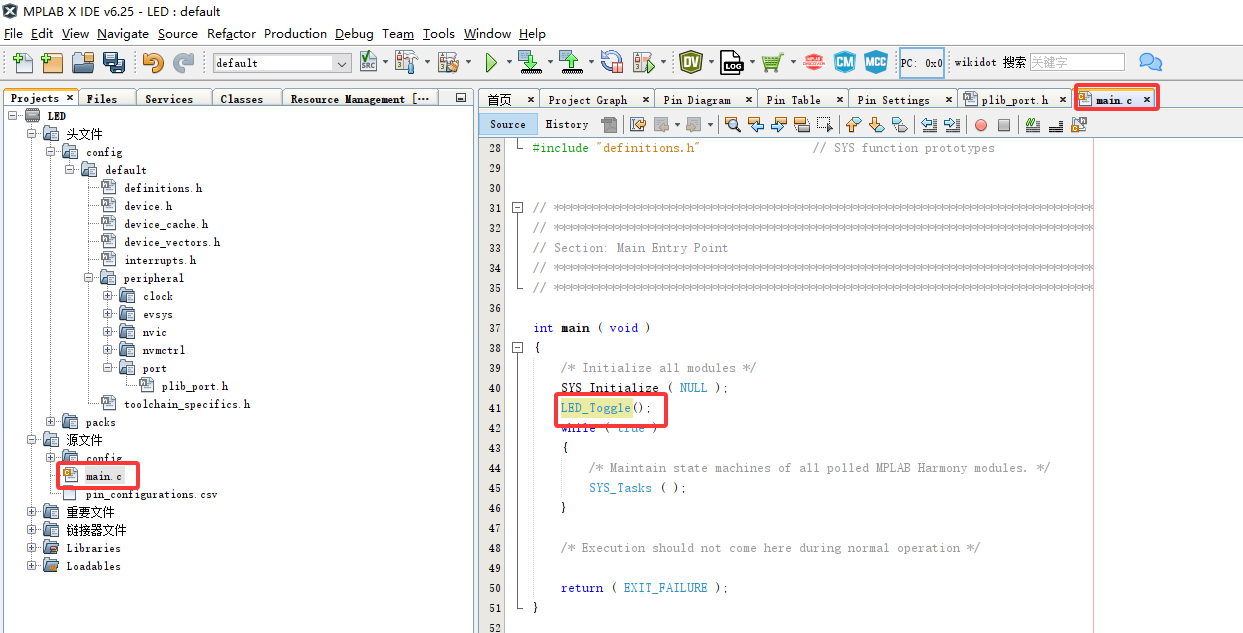 最后一步,在 main 中调用 LED_Toggle 函数,实现LED点亮。