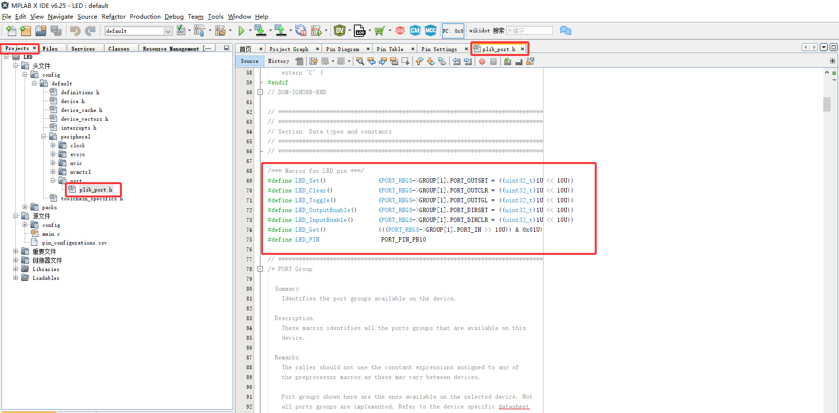 下图展示了生成的projects,可查看由 MPLAB Harmony v3 配置器生成的新文件。查看 plib_port.h 文件,确定点亮 LED 所需的内容已生成。双击 plib_port.h 文件以在工作区中打开它。