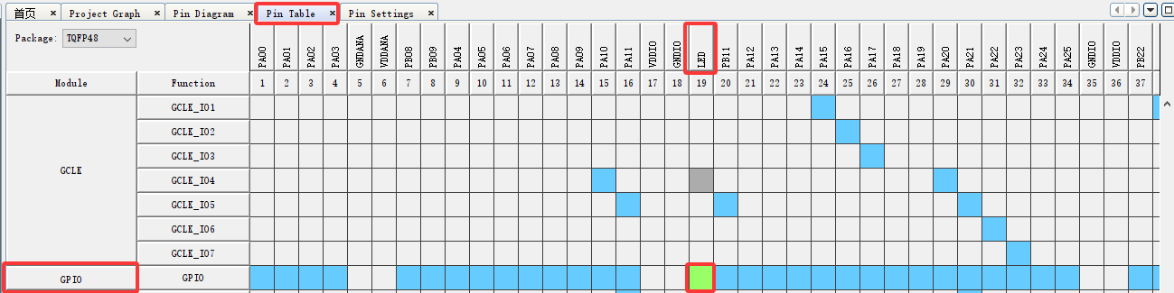 在为 PB10 更新引脚属性后的引脚设置中,可以在Pin Table窗口中看到自定义名称。高亮显示的框表示这些引脚被定义为用作 GPIO。