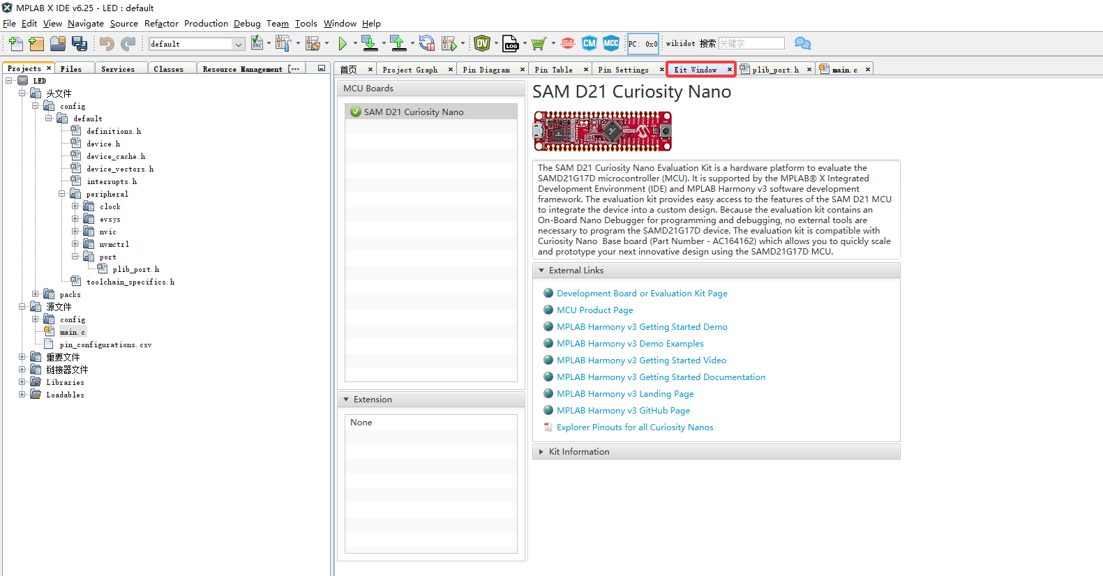 本次使用的是 SAM D21 Curiosity Nano 评估板。该板自带板载调试器(nEDBG),插上 USB 就能仿真和打印串口,不需要额外的调试器。MPLAB X IDE版本为v6.25,xc32版本为v5.00。
