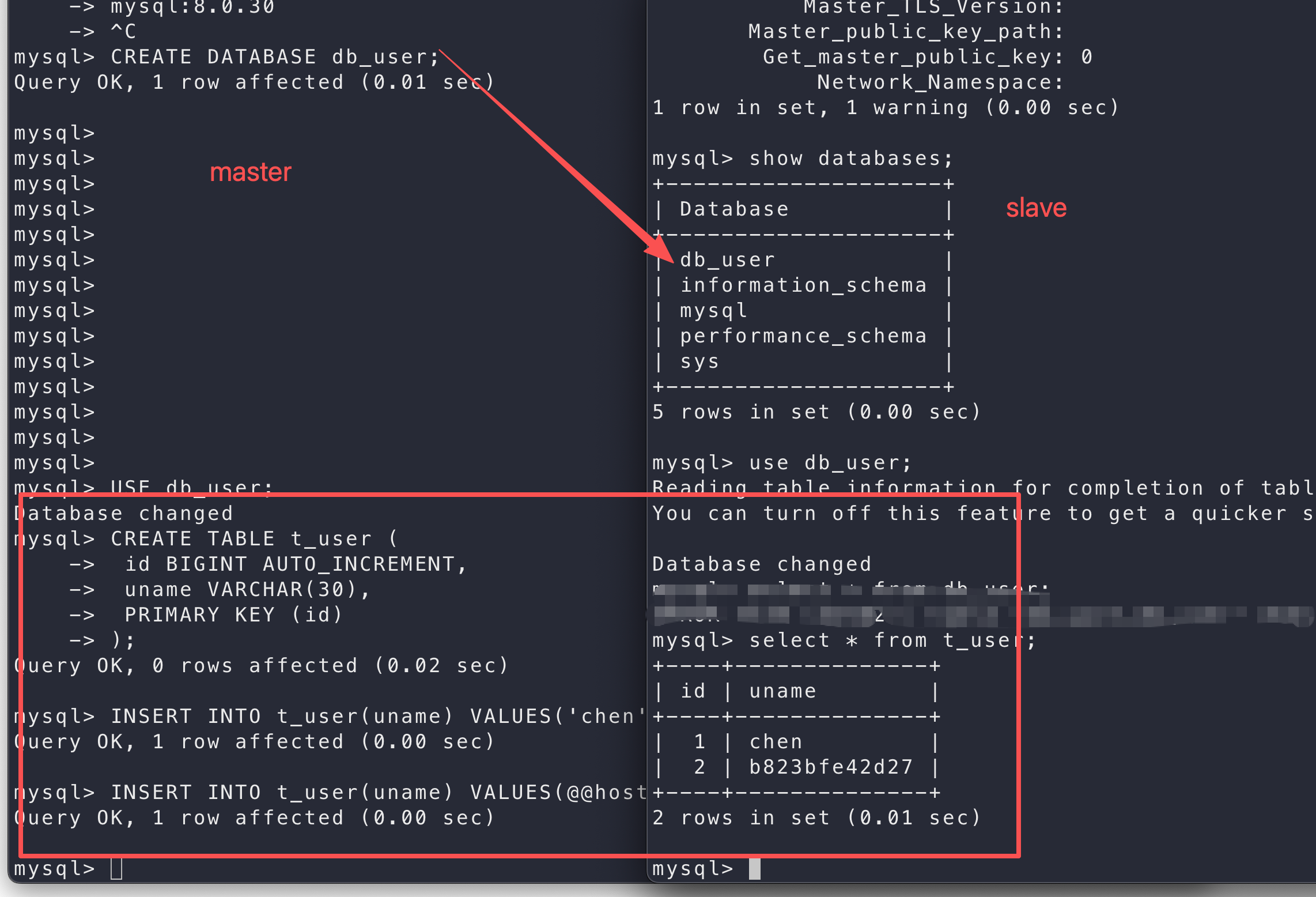 在主机中执行以下SQL,在从机中查看数据库、表和数据是否已经被同步