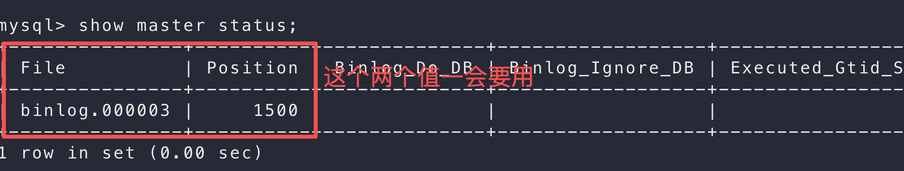 # 对应file和 position 的值,前面在master中获取的 file: binlog.000003 position:1500