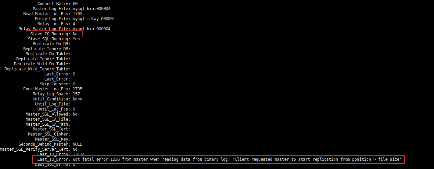 典型的错误例如: Last_IO_Error: Got fatal error 1236 from master when reading data from binary log: 'Client requested master to start replication from position > file size'