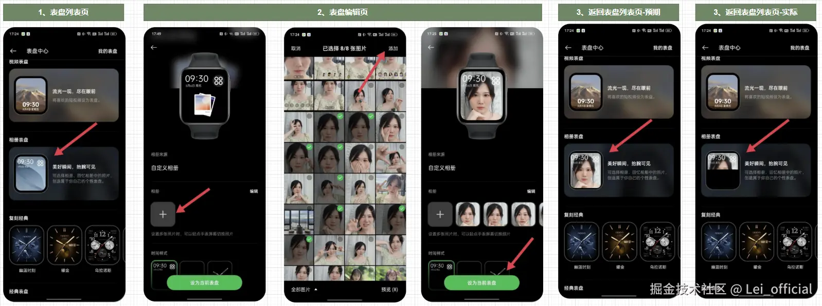 暂且称之为"手表主题模块",用来管理智能手表主题的样式,用户可以自定义智能手表上的字体、颜色、布局、背景图等,当用户完成设置后,生成当前配置下的预览图,并保存在应用数据目录下(Android/data/packageName/files/aaa_111.png),其它页面(例如表盘列表页)监听到预览图变化的事件后,更新 UI,展示出最新的预览图。