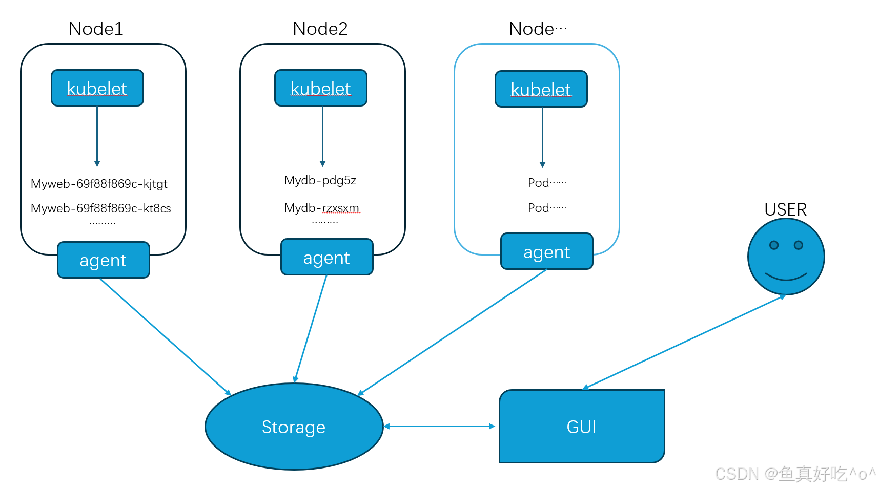 每个节点有一个agent端去收集对应pod服务的日志,然后将收集的日志做日志过滤、格式化、打标签(比如关联 Pod/Node 的 K8S 元数据) 再写入 Storage下,通过GUI支持的数据源将收集到的日志以图形化的方式展示给用户查看与检索。