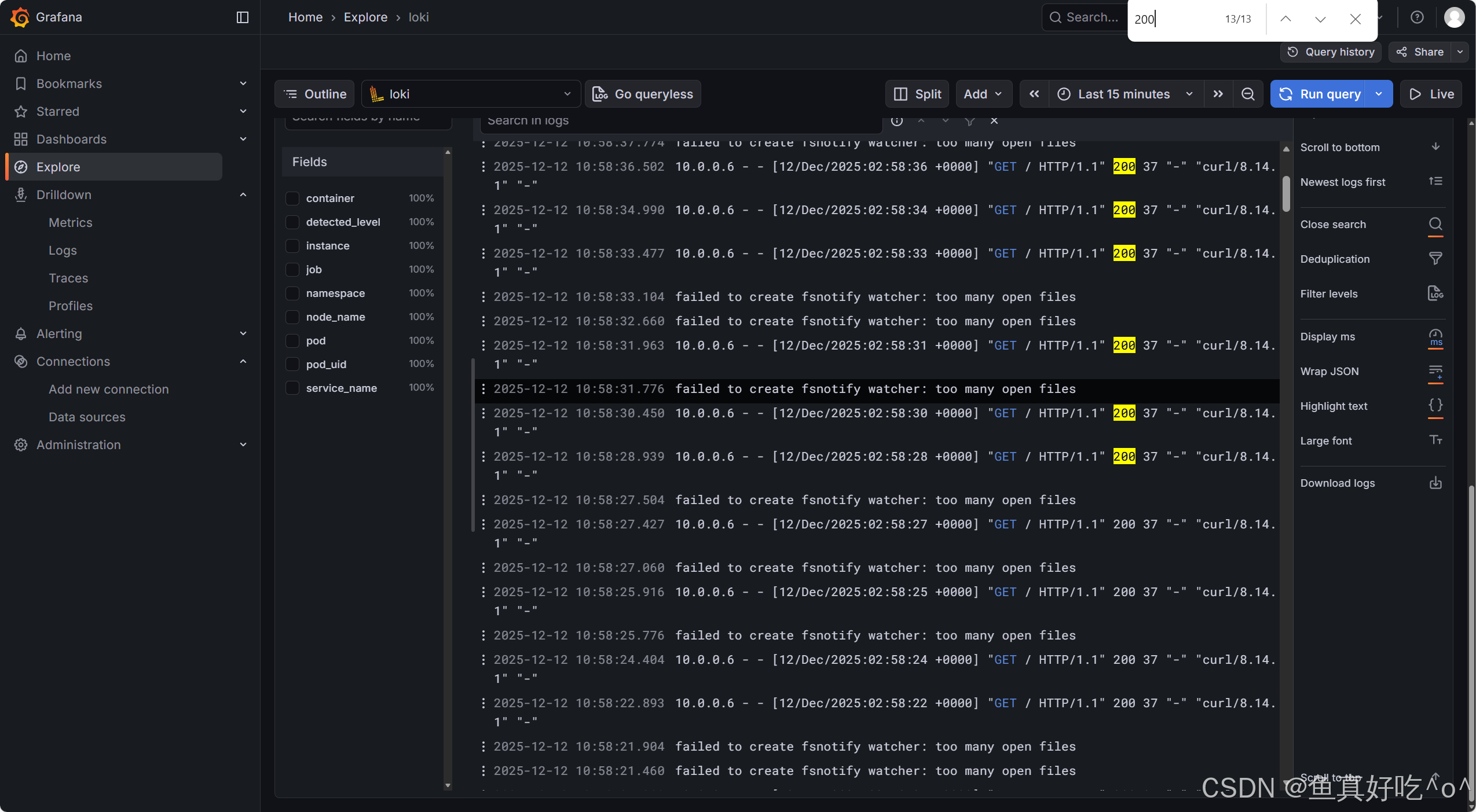 如果需要更复杂的字段检索(比如精确匹配、正则、提取字段),可以点击界面右上角的「Code」标签(当前是「Builder」模式),直接写LogQL 查询语句。