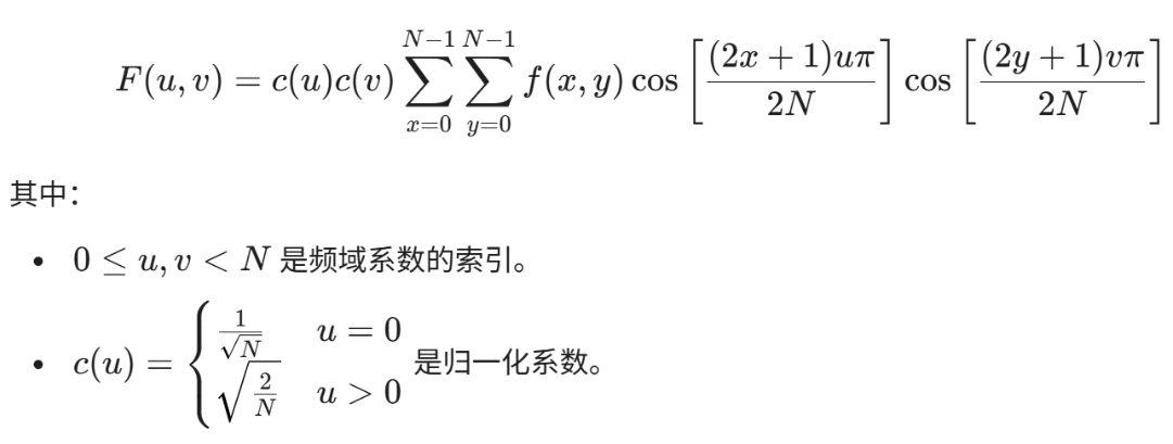 对于一个 N * N 的像素块 f(x, y),其二维 DCT 变换 F(u, v) 定义为: