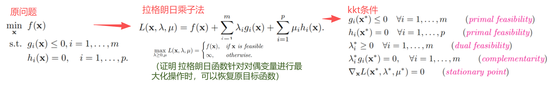 ◦ KKT 条件 (Karush-Kuhn-Tucker Conditions): 这是约束优化最优性条件的"黄金标准",它将拉格朗日乘子法推广到了包含不等式约束的一般情况。它包含四个部分: