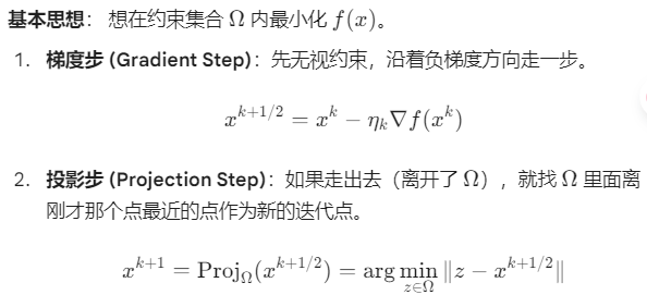 ◦ 投影梯度法 (Projected Gradient Method): 梯度下降法在约束问题上的直接推广,适用于可行集结构简单、投影计算廉价的场景。