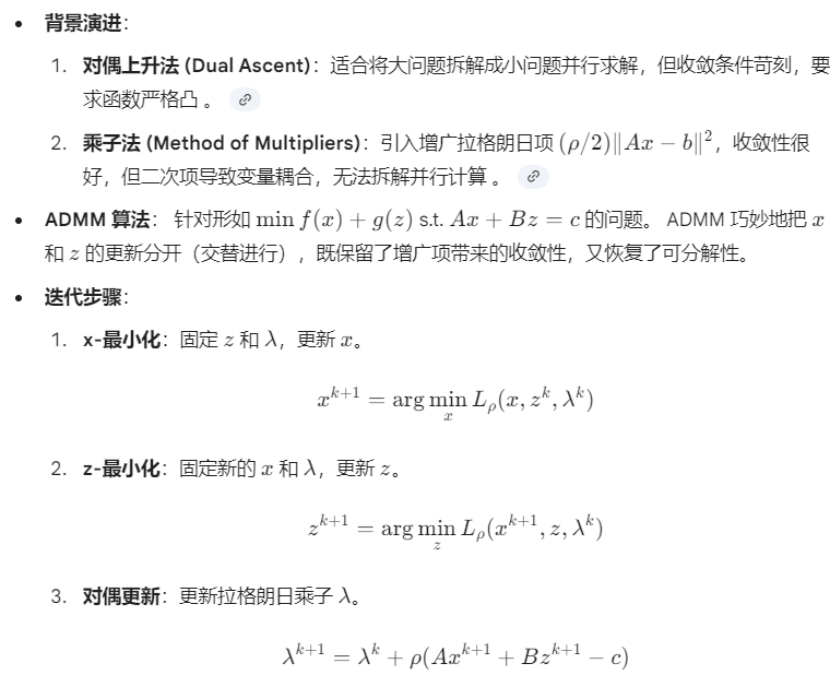 ◦ 交替方向乘子法 (ADMM): 一个强大的分解协调算法,特别适用于目标函数或约束具有可分离结构的复杂大规模问题,在分布式计算和现代机器学习中扮演着重要角色。