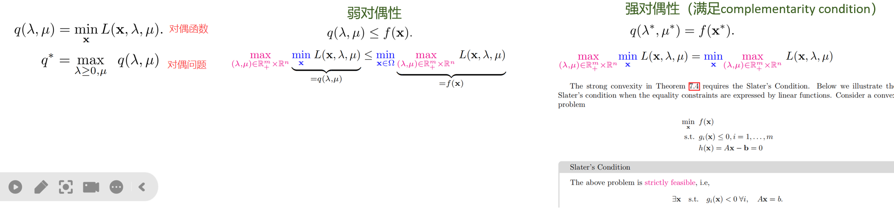 ◦ 对偶性 (Duality): 通过构造对偶问题,为原始问题提供一个下界(弱对偶),在某些条件下甚至可以得到与原始问题相同的解(强对偶),从而开辟了全新的求解路径。