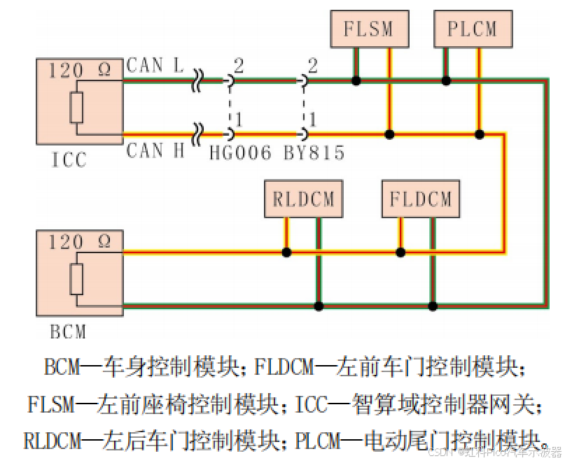 查看车身CAN总线电路(图5),发现偶发与ICC失去通信的控制模块主要集中在车身CAN总线的一侧,即图5中导线连接器HG006和BY815右侧。