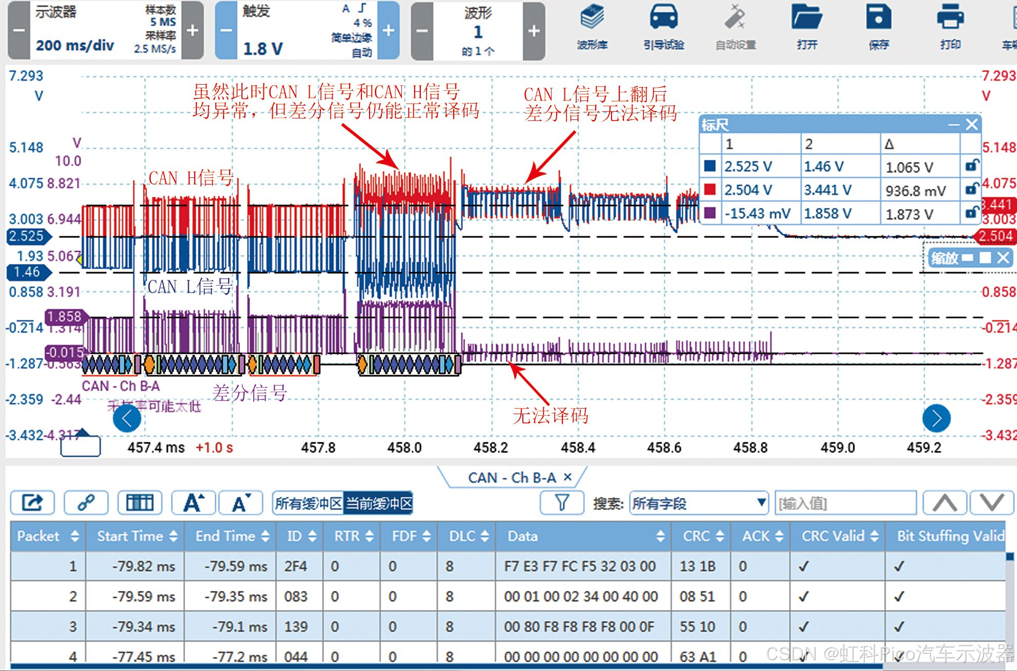 局部放大信号波形(图3),并对CAN H信号与CAN L信号的差分信号进行译码,发现当CAN L信号上翻时,差分信号电压接近0 V,译码失败,说明此时信号传输失败。