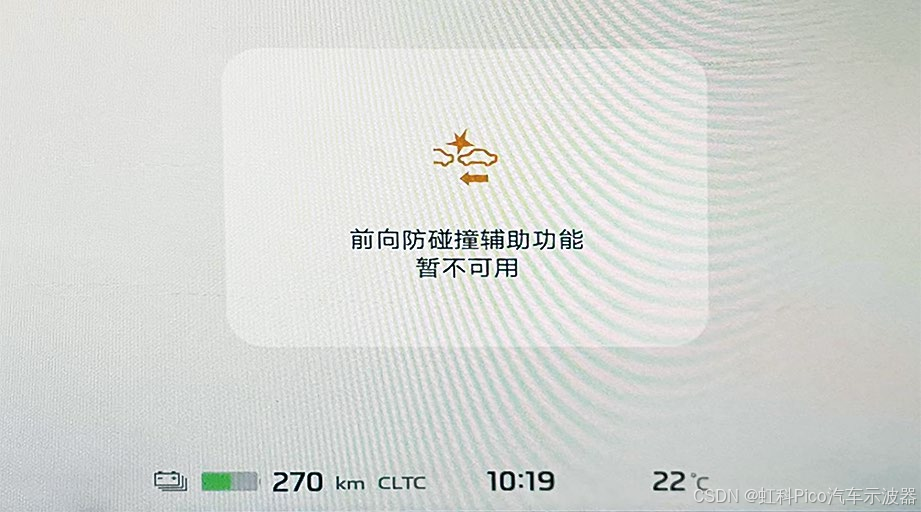 一辆2023款智己LS7车,搭载后轮驱动电机,动力电池存储能量为90 kW·h,最大行驶续航里程为602 km,累计行驶里程约为3.3万km。该车仪表偶尔提示"前向防碰撞辅助功能暂不可用"(图1),且前照灯模式偶尔在"自动"与"近光灯"间来回切换。