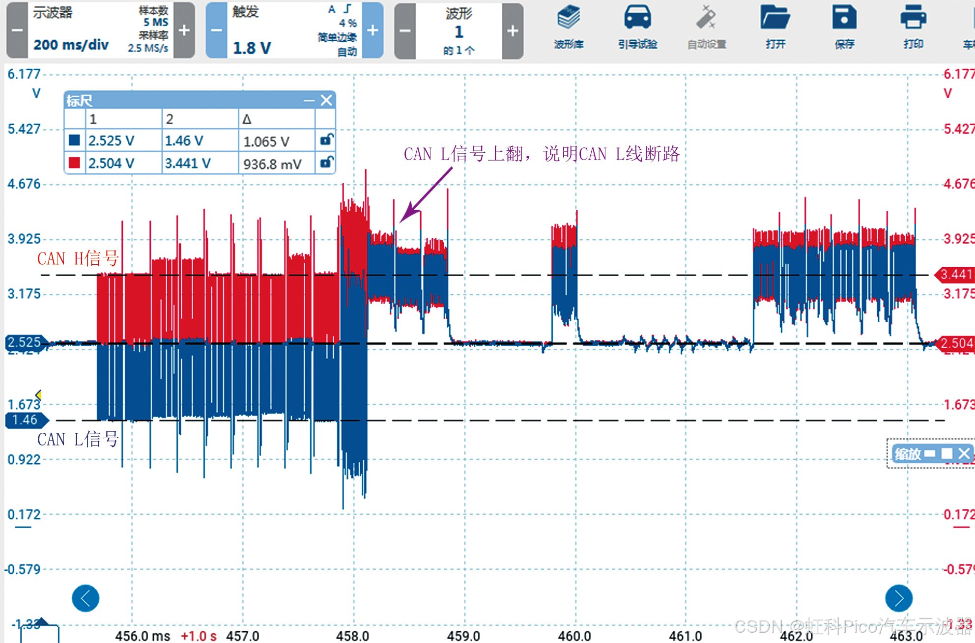 用虹科Pico汽车示波器测量车身CAN总线上的信号波形,反复试车,捕捉到故障出现时的相关波形如图2所示。分析可知,CAN L信号偶尔上翻,基本与CAN H信号一致,这符合CAN L线发生断路时的特征波形,由此推断车身CAN L线偶尔发生断路。