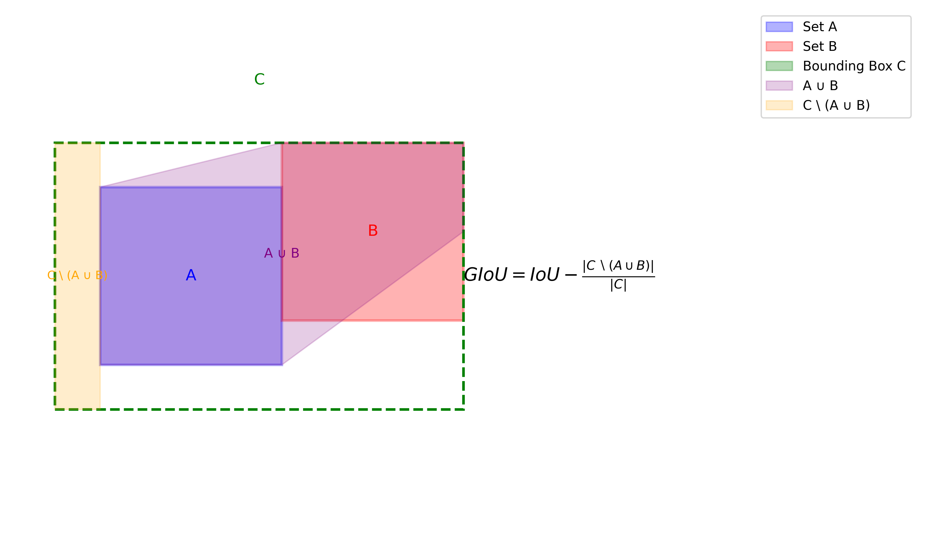 G I o U = I o U − ∣ A ∖ B ∣ − ∣ A ∩ B ∣ ∣ C ∣ GIoU = IoU - \frac{|A \setminus B| - |A \cap B|}{|C|} GIoU=IoU−∣C∣∣A∖B∣−∣A∩B∣