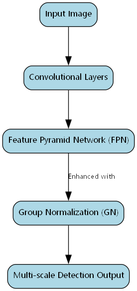 特征金字塔网络(FPN)是现代目标检测算法中常用的多尺度特征融合方法。在我们的FCOS实现中,采用了FPN_GN(Group Normalization)作为检测头,以进一步提升模型的检测性能。